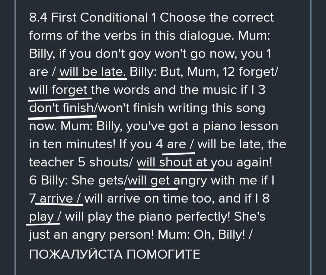 8.4 First Conditional 1 Choose the correct forms of the verbs in this dialogue. Mum: Billy, if you don't goy won't go now, you 1 are / will be late. Billy: But, Mum, 12 forget/ will forget the words and the music if I 3 don't finish/won't finish writing this song now. Mum: Billy, you've got a piano lesson in ten minutes! If you 4 are / will be late, the teacher 5 shouts/ will shout at you again! 6 Billy: She gets/will get angry with me if I 7 arrive / will arrive on time too, and if I 8 play / will play the piano perfectly! She's just an angry person! Mum: Oh, Billy! / ПОЖАЛУЙСТА ПОМОГИТЕ