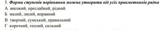 5. Форми ступенів порівняння можна утворити від усіх прикметників рядка А високий, преслабкий, рiдний Б малий, лисий, вправний В творчий, сумський, правильний Г короткий, теплий, сильний