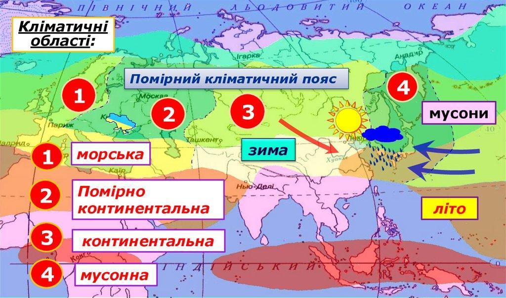 В межах помірного типу клімату виділяють такі кліматичні області: