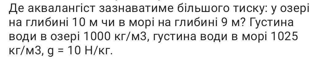 ПОМОГИТЕ ПЖ ДАМ 70 БАЛОВ СРОЧНО!! Де аквалангіст зазнаватиме більшого тиску: у озері на глибині 10 м чи в морі на глибині 9 м? Густина води в озері 1000 кг/м3, густина води в морі 1025 кг/м3, g = 10 Н/кг.