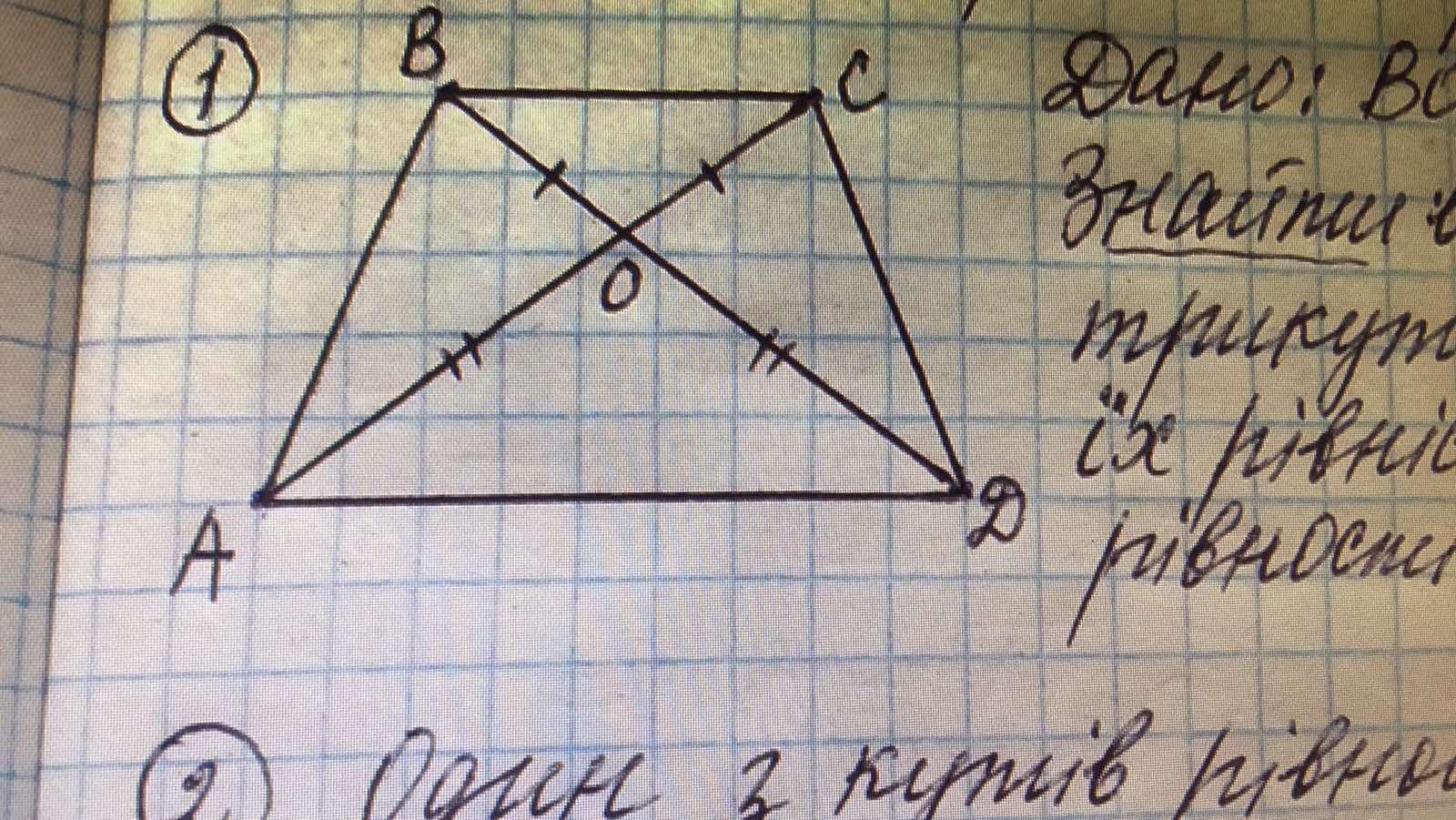 Дано: BO=CO, AO=DO Знайти всі пари рівних трикутників та довести їх рівність за ознаками рівності трикутників
