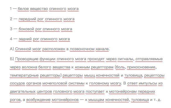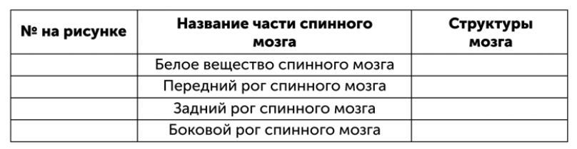 1. Рассмотрите рисунок, на котором схематично изображено строение спинного мозга. Обозначьте части спинного мозга на рисунке цифрами и запишите их в соответствующую строку таблицы. Соотнесите название части спинного мозга и структуры, которая её образует. В ответе используйте термины, указанные ниже