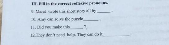 III. Fill in the correct reflexive pronouns. 9. Marat wrote this short story all by. 10. Amy can solve the puzzle_ 11. Did you make this_ 12.They don't need help. They can do it