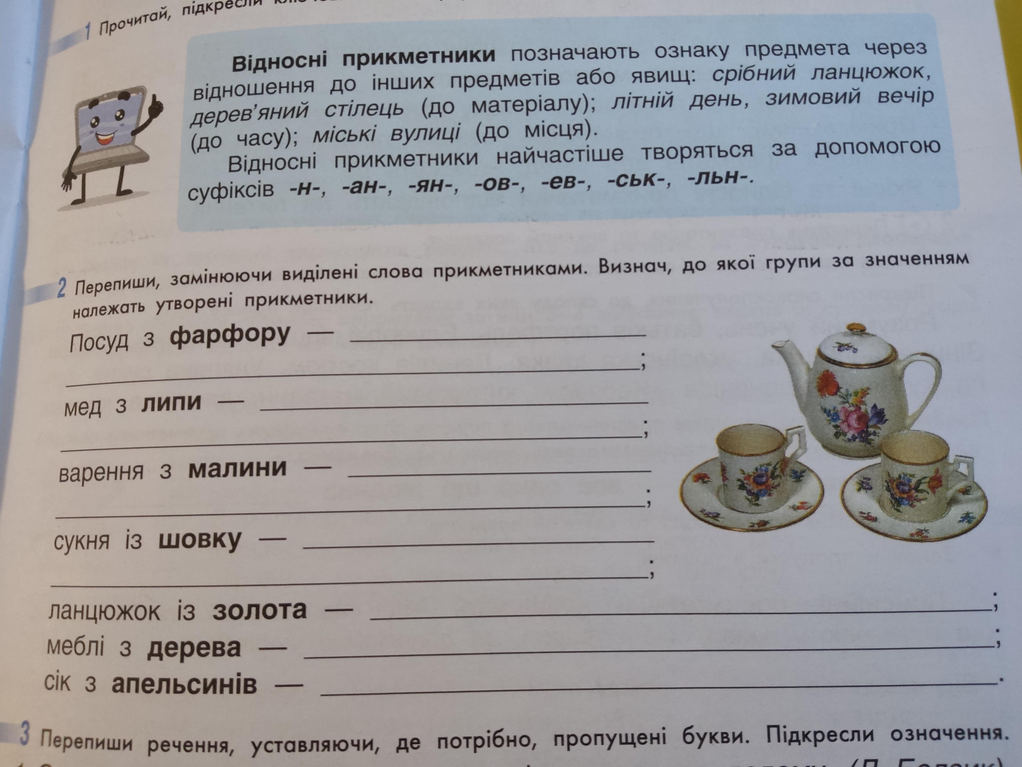 Перепиши замінюючи виділені слова прикметниками. Визнач до якої групи за значенням належать утворені прикметники