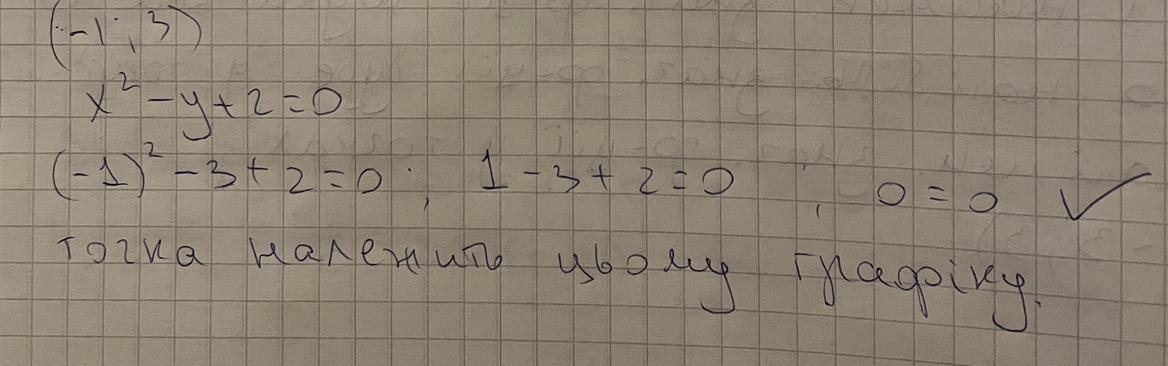 Щоб перевірити чи належить дана точка графіку, треба підставити значення х та у в рівняння і отримати на виході 0=0, якщо така тотожність виконуються, то пара чисел належить рівнянню