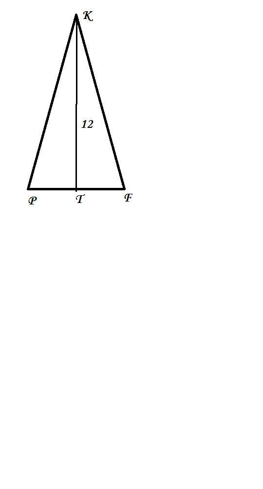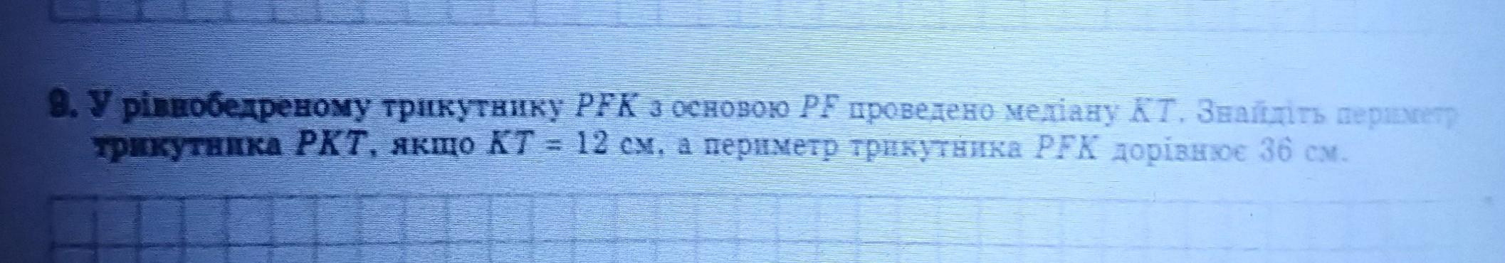 Дано: ΔPFK - рівнобедрений, РК=FK; Р(PFK)=36 см, КТ - медіана і висота, КТ=12 см. Р(РКТ) - ?