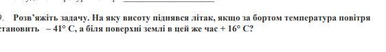 Відповідь:З кожними 100 м підйому вверх температура зменшується на 0,6С*. Відповідно з кожним 1 км температура зменшується на 6 С*. Отже маємо; (-41-16) : (-6) = -57: (-6) = 9,5 (км) або 9500 (м)