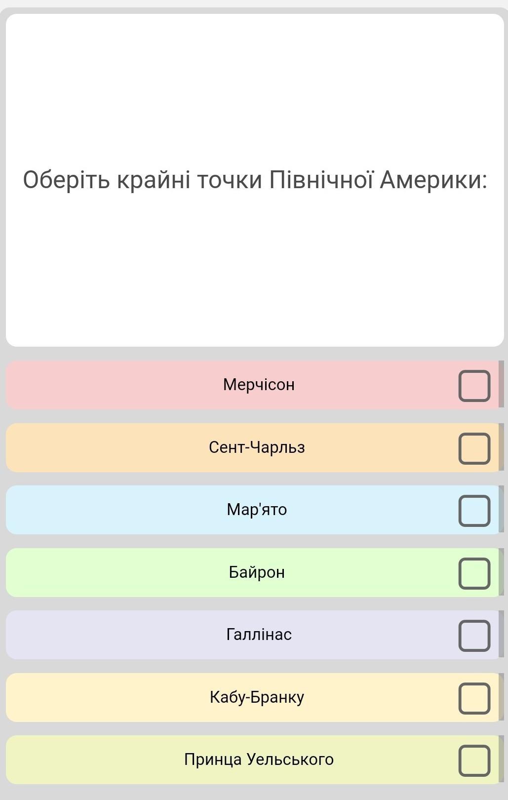 Відповідь:Крайня північна точка материка — мис Мерчисон на півострові Бутія в Канаді — розташований на 71°58' пн. ш., крайня південна точка материка — мис Мар'ято (7°12' пн. ш.), крайня західна – мис Принца Уельського (168°00' зх. д.), крайня східна — мис Сент-Чарльз (55°40' зх.