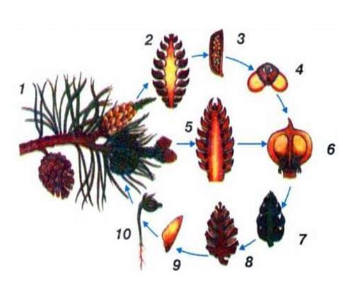 Відповідь:Життєвий цикл голонасінних на прикладі сосни звичайної:1 - гілка з шишками; 2 - чоловіча шишка; 3 - пилковий мішок; 4 - пилкове зерно; 5 - шишка з насінними зачатками; 6 - луска з насінними зачатками; 7 - запилена шишка; 8 - дозріла шишка з насінням, 9 - насінина; 10 -
