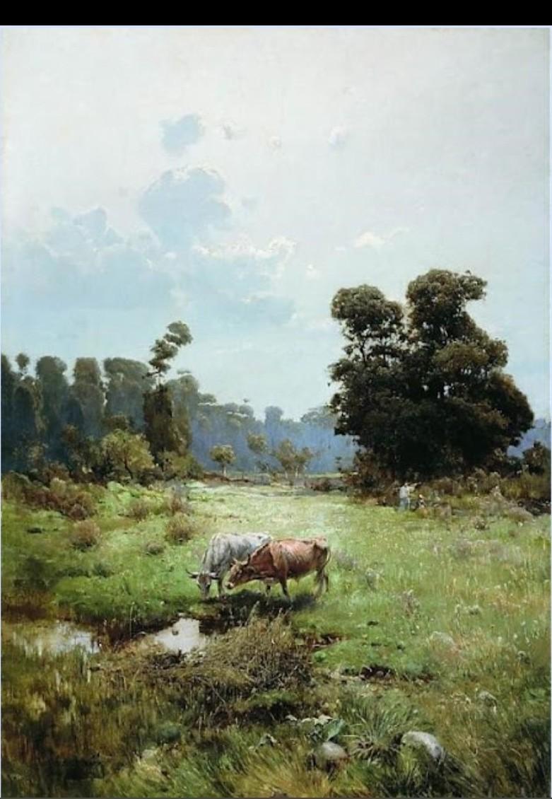 Пейзаж на котором видно синее небо, множество деревьев, животные которые пьют воду с затопивщего и обросшего сухой травой озера, в дали туман.