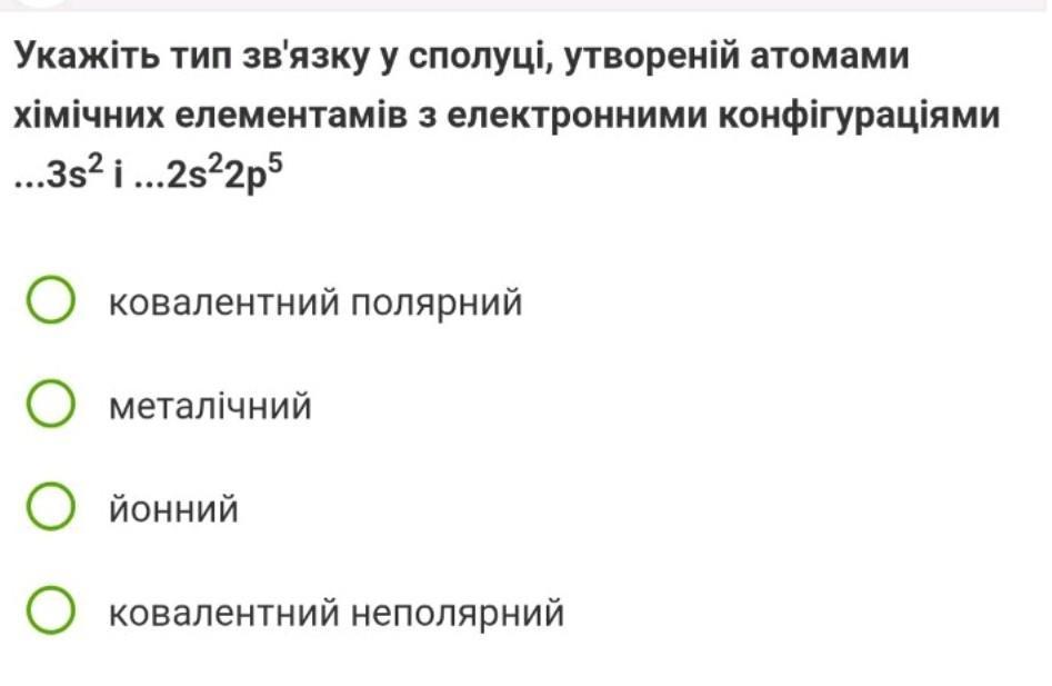 Укажіть тип зв'язку у сполуці, утвореній атомами хімічних елементамів з електронними конфігураціями ...3s² i...2s²2p5 ковалентний полярний металічний ЙОННИЙ ковалентний неполярний