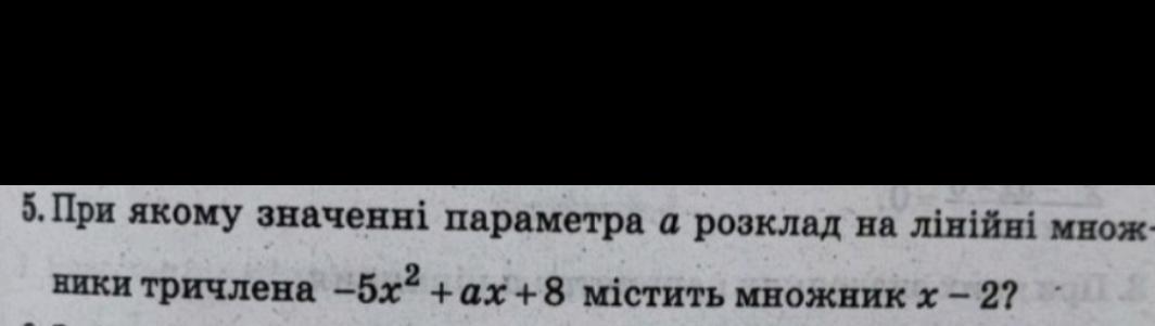 Ответ:берем ур-е -5х²+ах+8=0;поделим на -5 ;; 5х²-а/5-8/5=0;теперь по теореме Виєта система ур -й 2+х2=а/5;2×х2=-8/5 из2-го х2=-4/5=-0,8; подставим в1-е 2-0,8 =а/5 или 2-0,8=0,2а; 0,2а=1,2;а=6