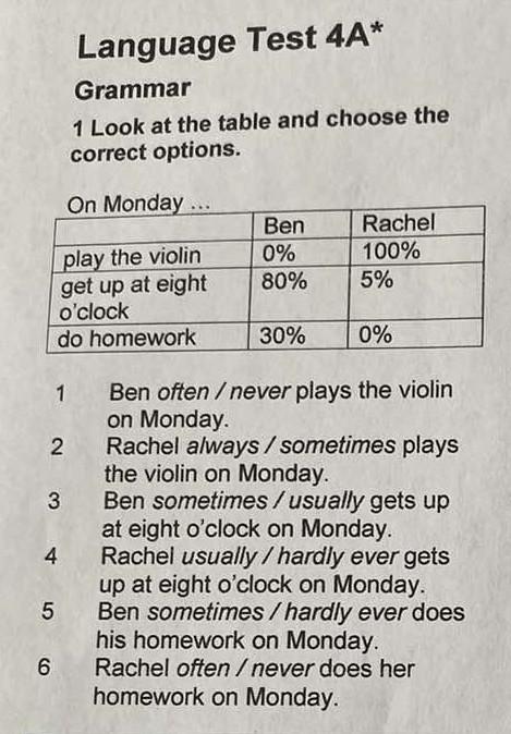 Language Test 4A* Grammar 1 Look at the table and choose the correct options. On Monday... play the violin get up at eight o'clock do homework 2 4 Ben 0% 80% 5 30% Rachel 100% 5% Rachel always / sometimes plays the violin on Monday. 3 Ben sometimes / usually gets up at eight o'clock on Monday. Rachel usually / hardly ever gets up at eight o'clock on Monday. Ben sometimes/hardly ever does his homework on Monday. 6 Rachel often/never does her homework on Monday. 0% Ben often/never plays the violin on Monday.