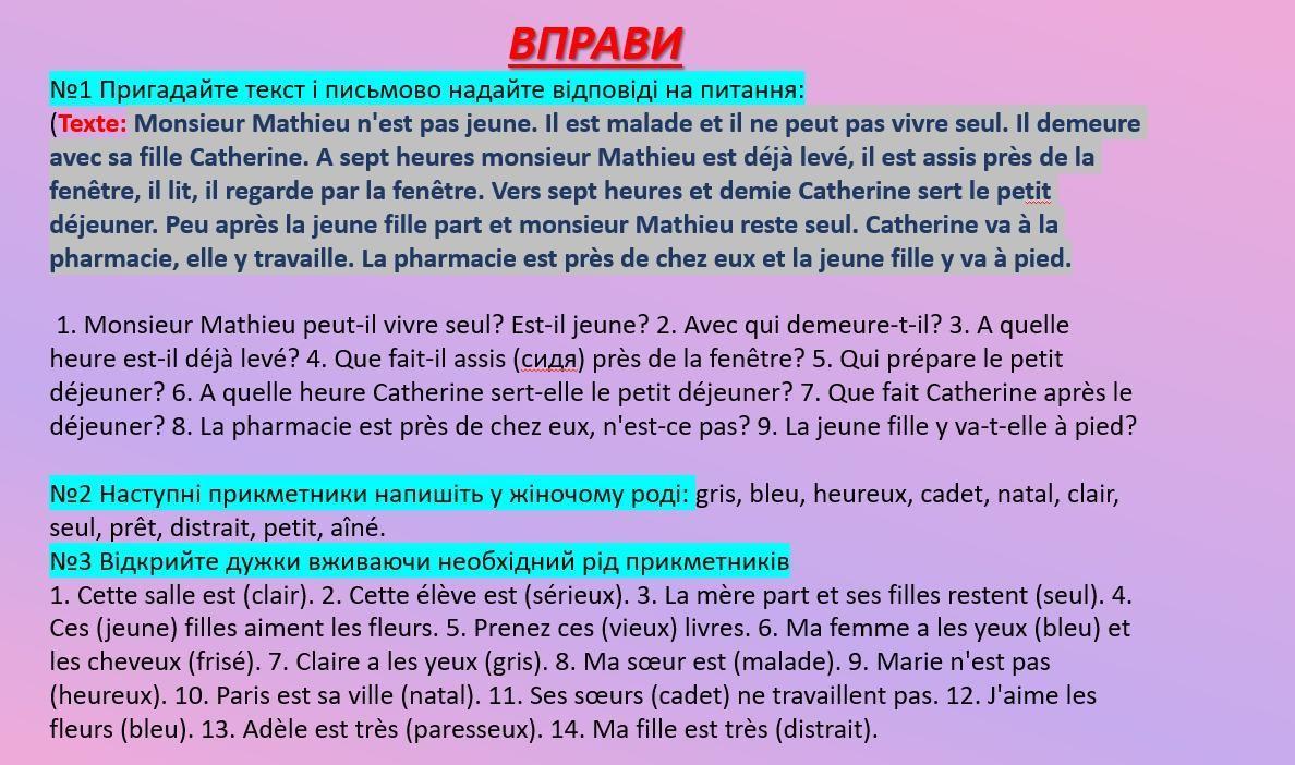 № 1: Судячи з тексту, месьє Матьє не може жити сам, оскільки він хворий. Живе з дочкою Катериною. Месьє Матьє не описаний у тексті як молодий. Він прокидається о 7 ранку і сидить біля вікна, читає та дивиться на вулицю. Катерина подає сніданок близько 7:30 ранку, після чого йде на роботу в аптеку, яка знаходиться неподалік, і йде туди пішки.