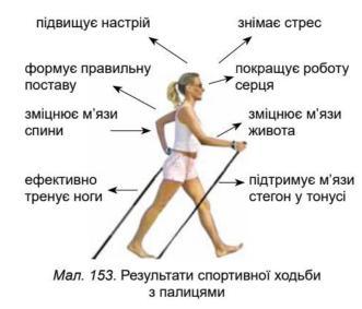 На малюнку 153 позначено вплив на організм людини спортивної ходьби з палицями. Цей вид фізичної активності поширений у народів скандинавських країн (фінів, шведів та інших). Історично його коріння походить від пастухів і паломників, які використовували палиці. Назвіть результати ходіння з палицями. Чому людина досягає таких результатів?