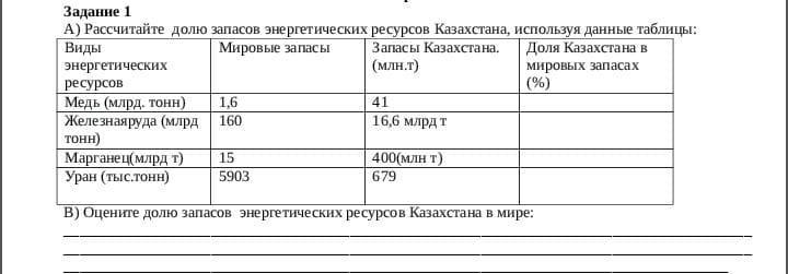 б) Для оценки доли запасов энергетических ресурсов Казахстана в мире необходимо сложить доли запасов каждого вида ресурсов, вычисленные в пункте А), и выразить результат в процентах.