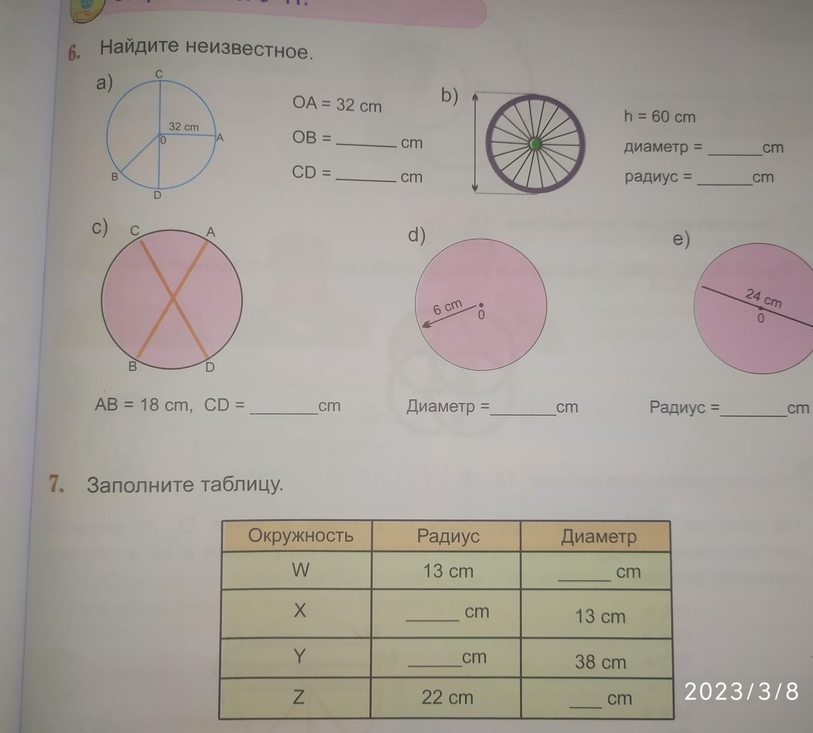 6) а) ОВ=32см; CD=64см; b) диаметр=60см; радиус=30см; с) CD=18см; d) диаметр=12см; е) радиус=12см