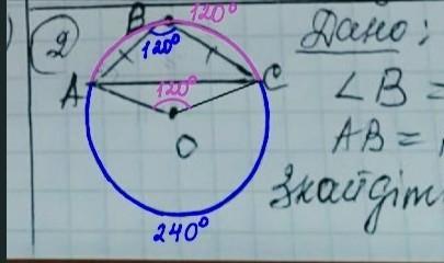 То есть ∠В = 120° и опирается на дугу АС , следовательно , ◡АС = 240° , тогда ◡АВС = 360° - 240° = 120°.