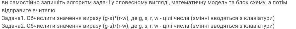 Цей код спочатку запитує користувача ввести значення для змінних g, s, r та w. Після цього він обчислює вираз (g-s)*(r-w) і зберігає його в змінній result. Нарешті, він виводить результат на екран.