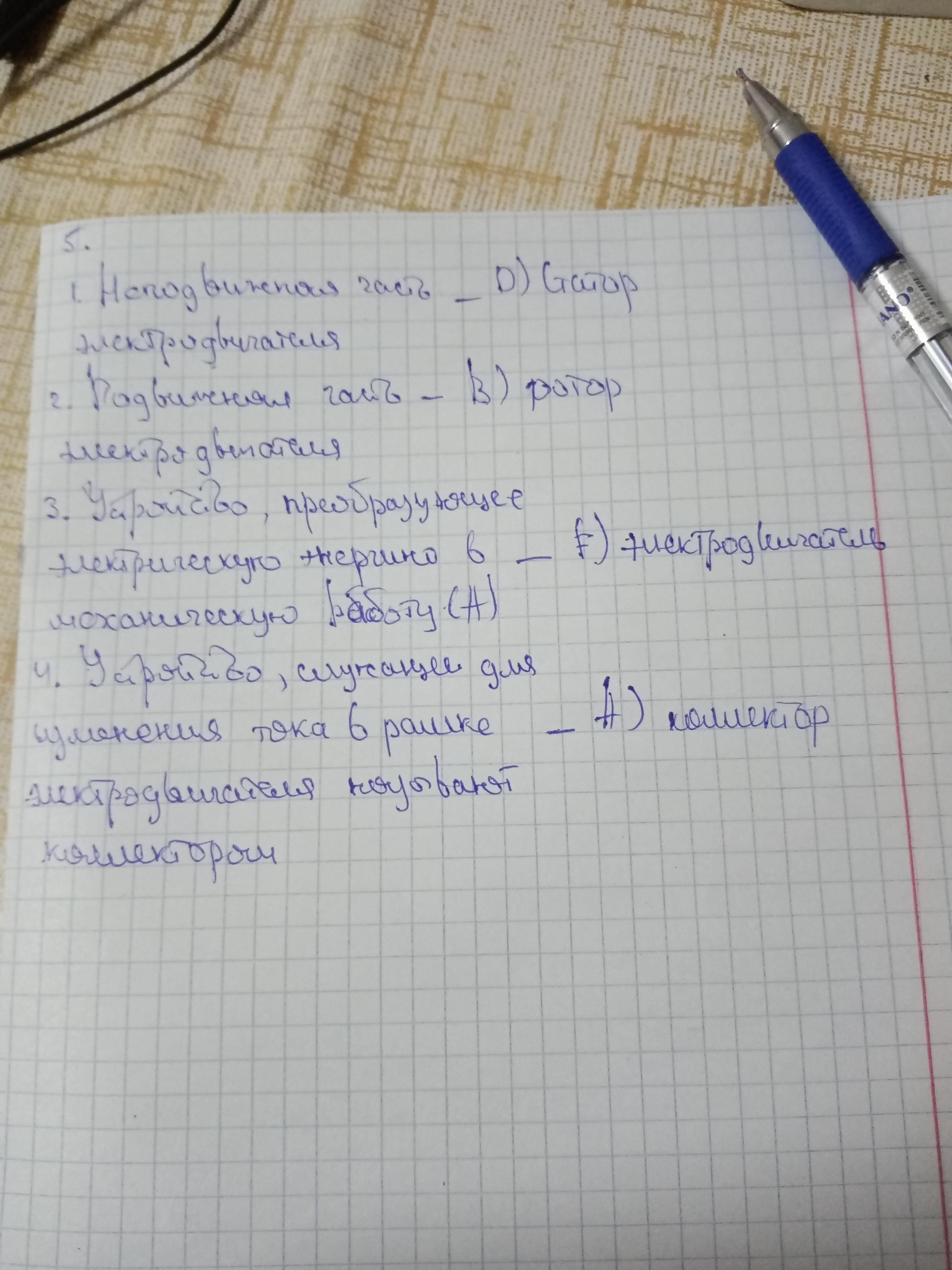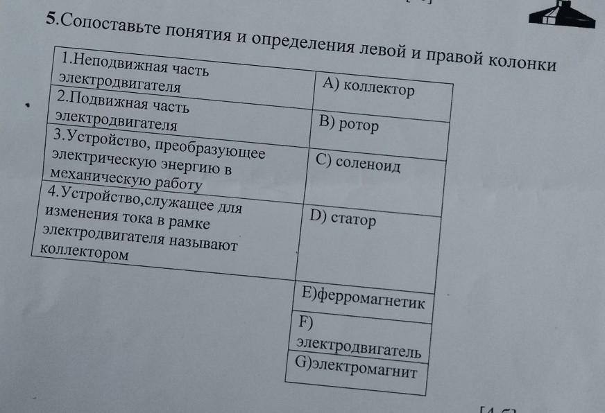 5.Сопоставьте понятия и определения левой и правой колонки А) коллектор 1.Неподвижная часть электродвигателя 2.Подвижная часть В) ротор С) соленоид электродвигателя 3. Устройство, преобразующее электрическую энергию в механическую работу 4. Устройство,служащее для изменения тока в рамке электродвигателя называют коллектором D) статор Е)Ферромагнетик электродвигатель G)электромагнит F)