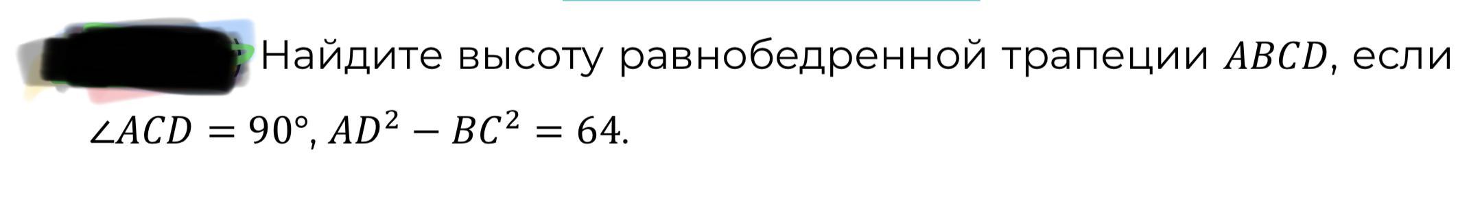 Найдите высоту равнобедренной трапеции , если ∠АСD = 90°, AD2 − BC2 = 64.