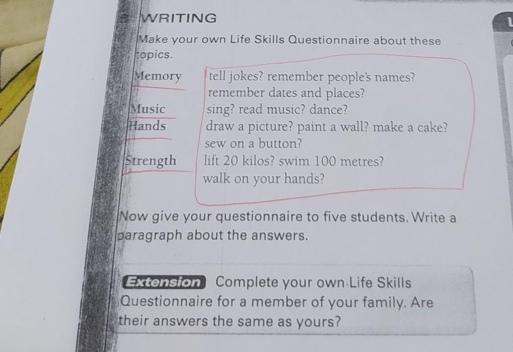 WRITING Make your own Life Skills Questionnaire about these topics. Memory Music Hands Strength tell jokes? remember people's names? remember dates and places? sing? read music? dance? draw a picture? paint a wall? make a cake? sew on a button? lift 20 kilos? swim 100 metres? walk on your hands? Now give your questionnaire to five students. Write a paragraph about the answers. Extension Complete your own Life Skills Questionnaire for a member of your family. Are their answers the same as yours? СРОЧНО СРОЧНО СРОЧНО СРОЧНО СРОЧНО СРОЧНО СРОЧНО ЗАРАНЕЕ БЛАГОДАРЮ!
