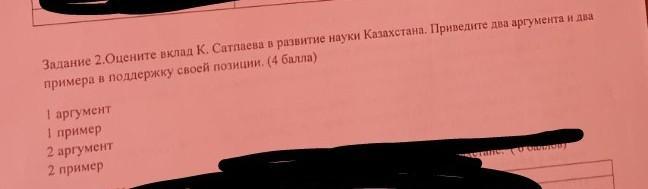 Задание 2.Оцените вклад К. Сатпаева в развитие науки Казахстана. Приведите два аргумента и да примера в поддержку своей позиции. (4 балла) 1 аргумент 1 пример 2 аргумент 2 пример топпен ооп