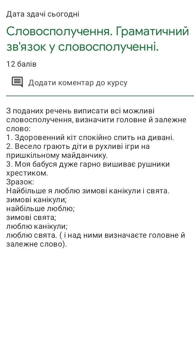 З поданих речень виписати всі можливі словосполучення, визначити головне й залежне слово: 1. Здоровенний кіт спокійно спить на дивані. 2. Весело грають діти в рухливі ігри на пришкільному майданчику. 3. Моя бабуся дуже гарно вишиває рушники хрестиком. Зразок: Найбільше я люблю зимові канікули і свята. зимові канікули; найбільше люблю; зимові свята; люблю канікули; люблю свята. ( і над ними визначаєте головне й залежне слово).