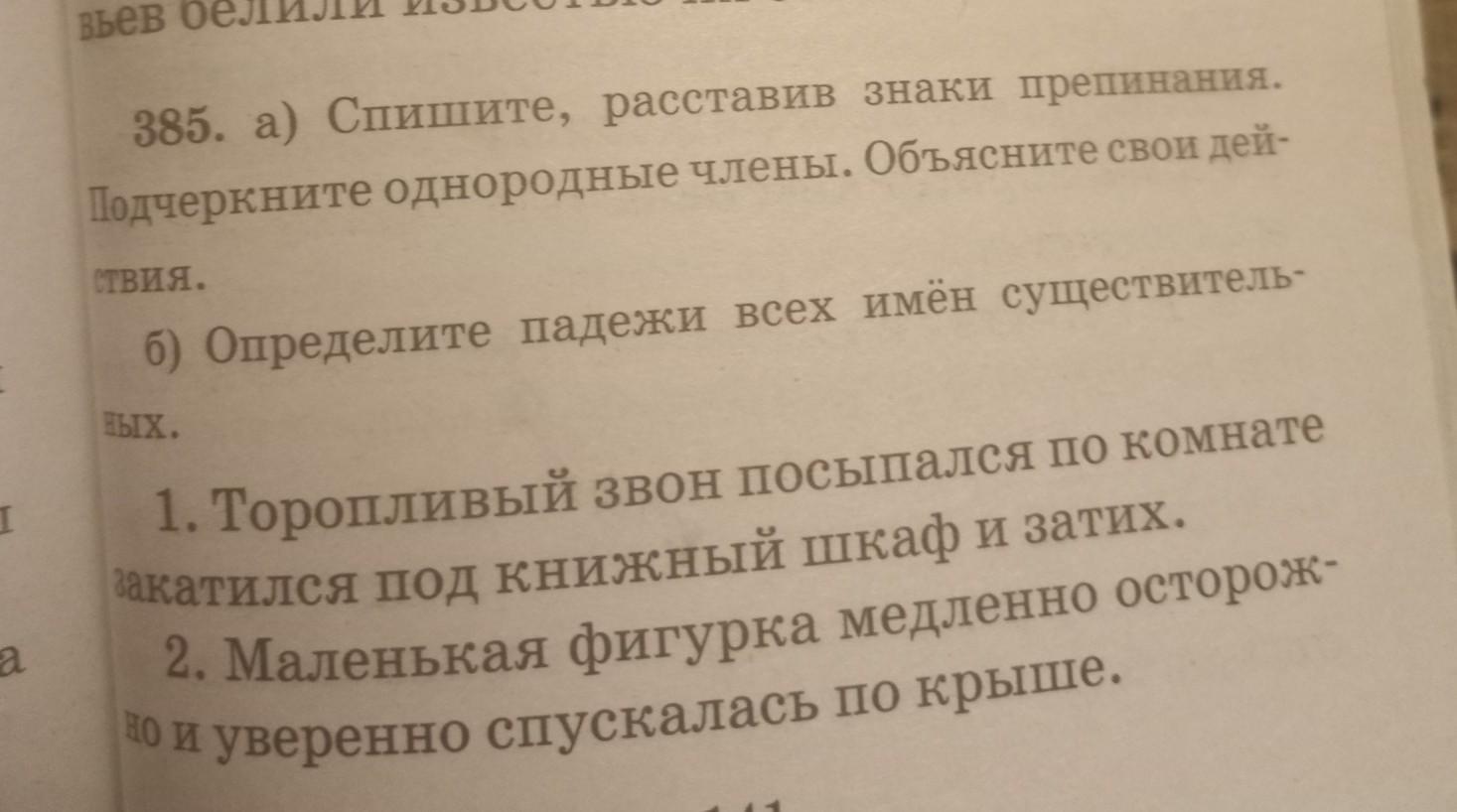 Ответ:Торопливый звон(Им.П.) посыпался по комнате(Д.п.), закатился под книжный шкаф(В.п.) и затих. 2. Маленькая фигурка (Им.п.) медленно, осторожно и уверенно спускалась по крыше(Д.п.). 3. Корабль(Им.п.) переливается через волну(В.п.) и соскальзывает с нее. 4. Люди(Им.п.) задирали головы(В.п.) к верху и прикрывали глаза(В.п.) ладонями(Тв.п.). 5. Гнезда ласточки(Им.п.) не вьют, а лепят из комочков грязи(Р.п.), илистого песка (Р.п.) и глины(Р.п.).