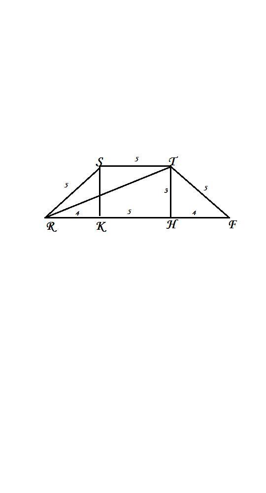 ДАЮ 100 БАЛЛОВ"Диагональ RT равнобедренной трапеции RSTF перпендикулярна боковой стороне TF. Найдите площадь трапеции, если ее основания равны 5 и 13 см."