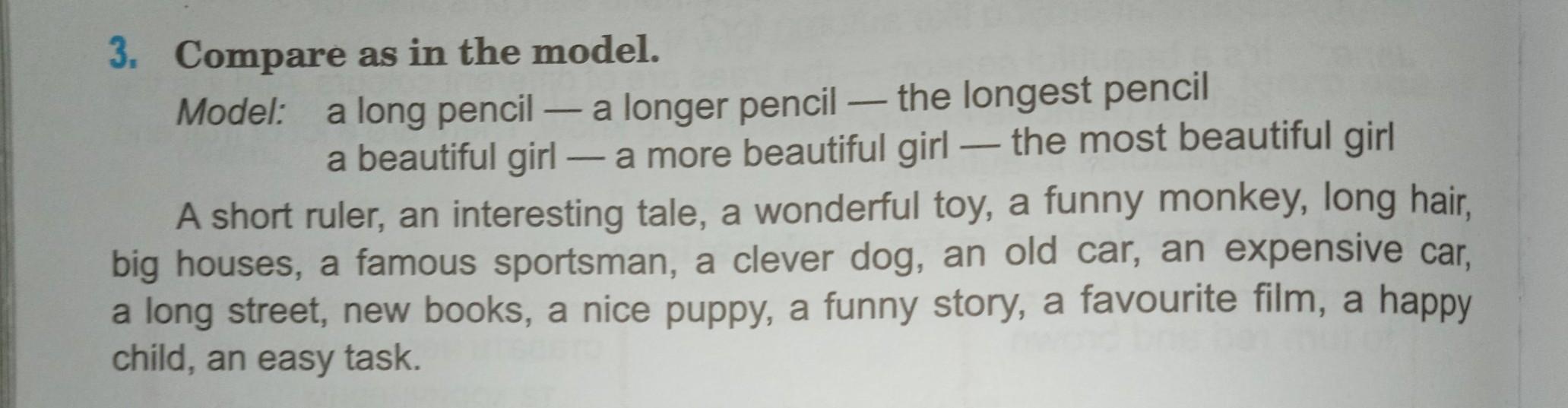 3. Compare as in the model. Model: a long pencil - a longer pencil a beautiful girl - a more beautiful girl a more beautiful girl - the most beautiful girl the longest pencil A short ruler, an interesting tale, a wonderful toy, a funny monkey, long hair, big houses, a famous sportsman, a clever dog, an old car, an expensive car, a long street, new books, a nice puppy, a funny story, a favourite film, a happy child, an easy task.