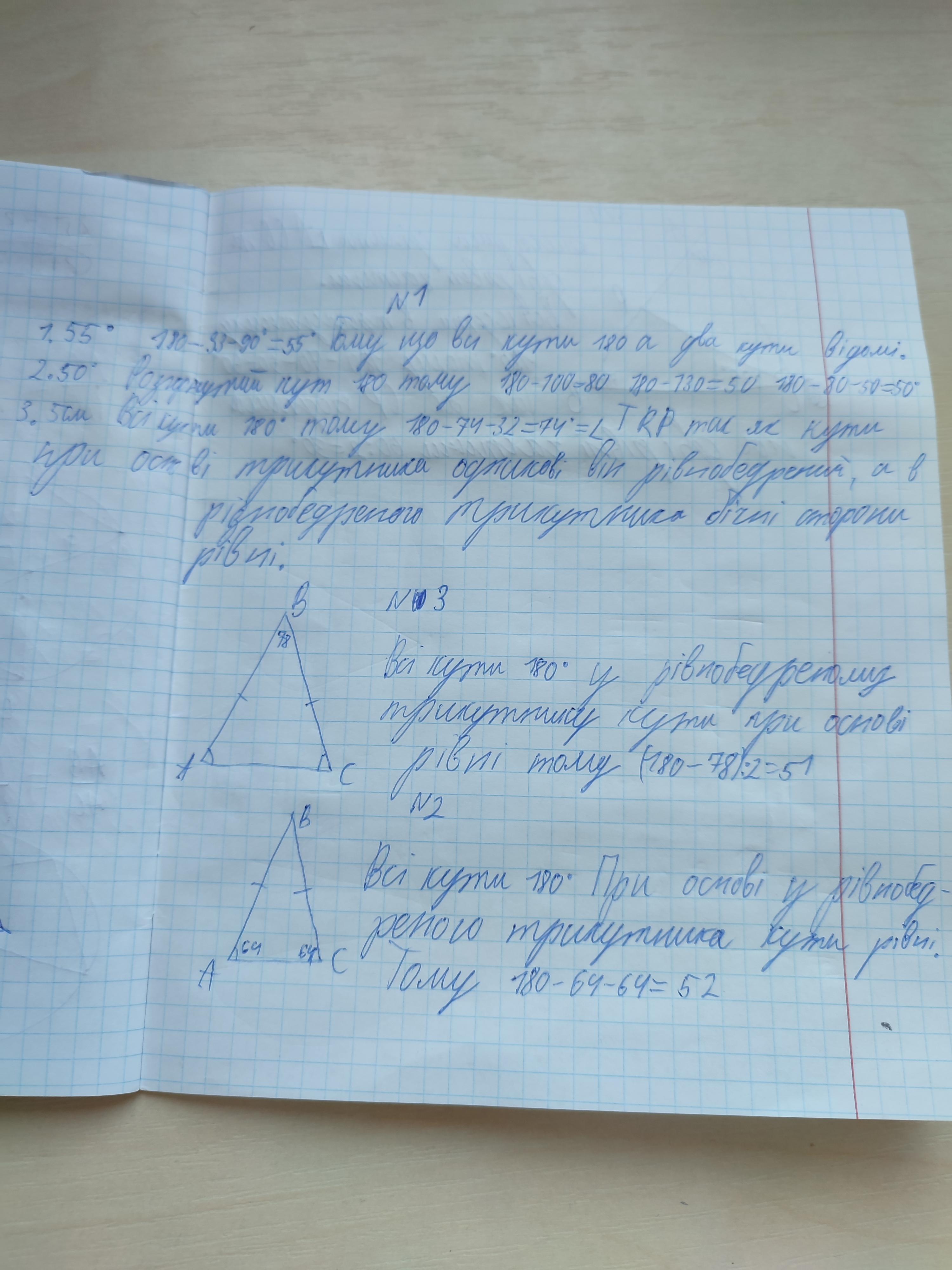 № 1. Знайдіть кут або сторону, що позначенi знаком запитання: 1 2 33° № 4. 100% A B P 130° B C R T 3 74° Зауваження!!! Обов'язково зробіть креслення і наведіть обґрунтування до розв'язання. 5 cm № 2. Кут при основі рівнобедреного трикутника дорівнює 64°. Знайдіть кут при вершині цього трикутника. 32° № 3. Знайдіть кути при основі рівнобедреного трикутника, якщо кут при вершині цього трикутника дорівнює 78°. Уmpukymnury ABC проведено бісектрису СР. Знайдіть