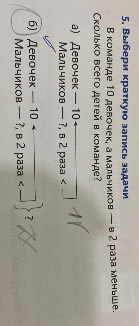 5. Выбери краткую запись задачи в команде 10 девочек, а мальчиков Сколько всего детей в команде? - - в 2 раза меньше.