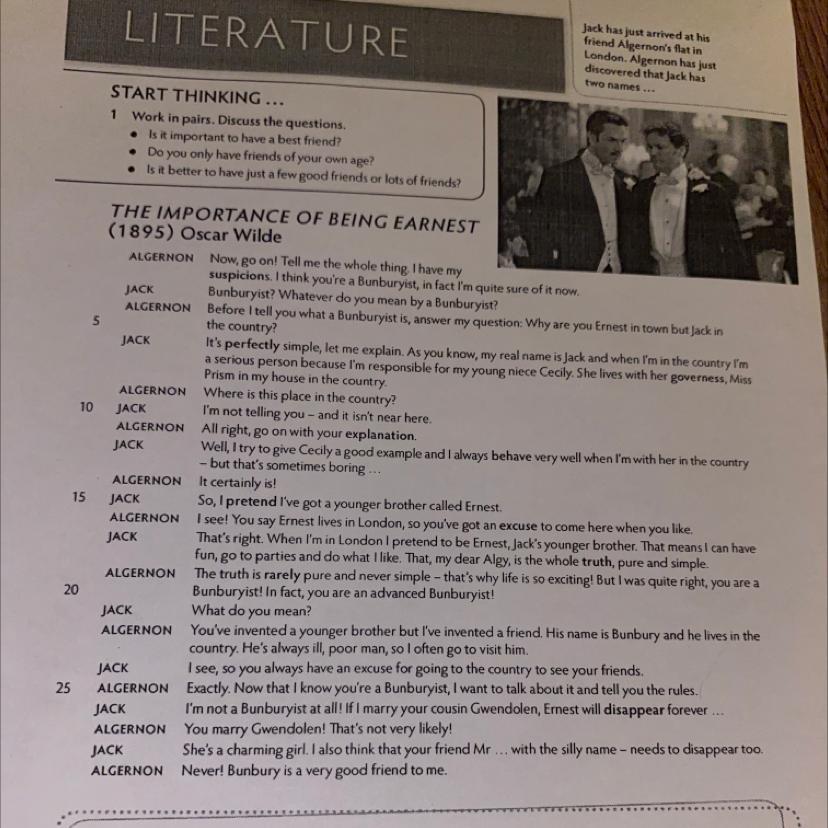 Algernon and Jack discuss Jack's imaginary brother Ernest and his plans to propose to Algernon's cousin, Gwendolen. Algernon is skeptical of Jack's intentions and demands to meet Ernest. Jack confesses that Ernest does not exist and that he invented him as an excuse to visit the city. Algernon reveals that he also has a fictional friend named Bunbury, whom he uses as an excuse to avoid social obligations. The two men bond over their shared deception and agree to keep each other's secrets.