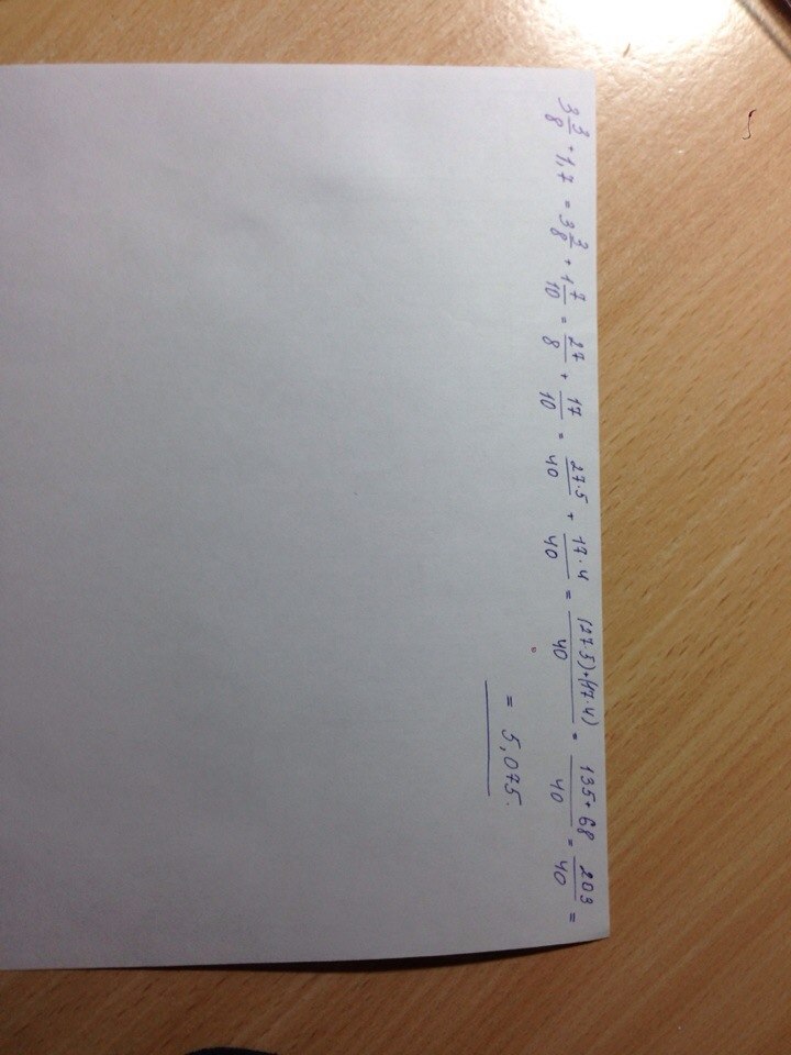 3 3/8 + 1,7= 3 15/40 + 1 35/40= 4 50/40= 5 10/40= 5 1/4