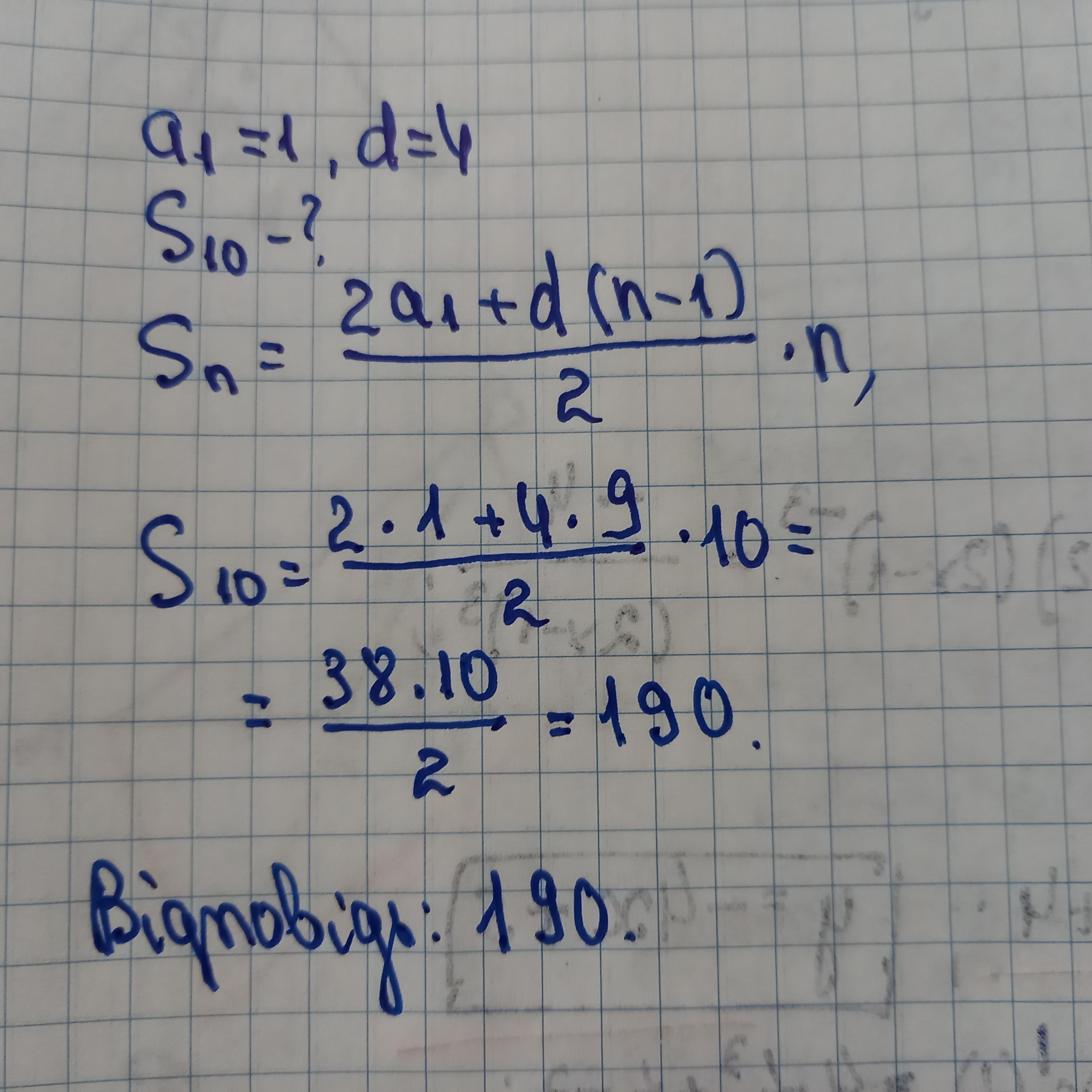 S = (10/2) * (2*1 + (10-1)*4) = 5 * (2 + 36) = 5 * 38 = 190