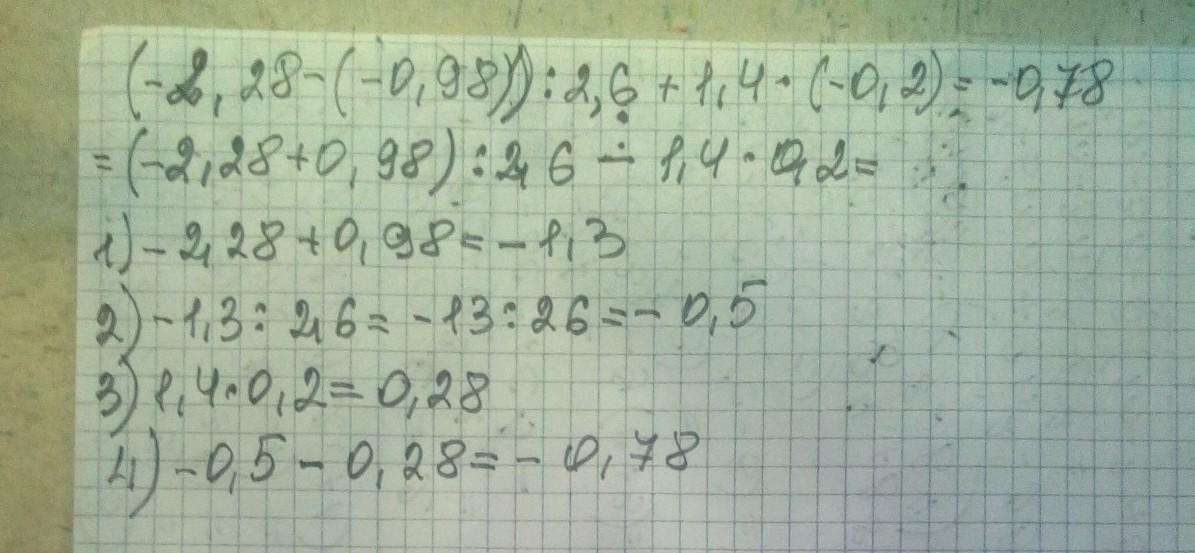 3)(-2,28+0,98)/2,6-1,4×0,2=0,74