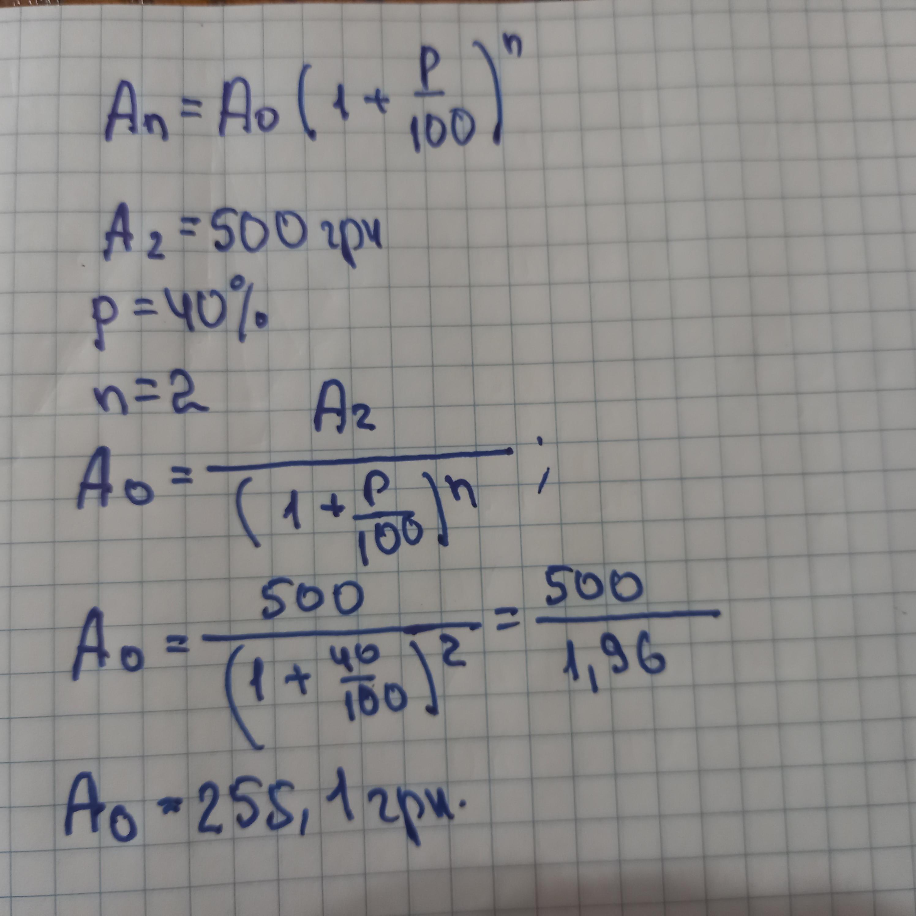 Банк виплачує 40% річних. Скільки грошей треба покласти в банк, щоб через 2 роки на рахунку було 500 грн.