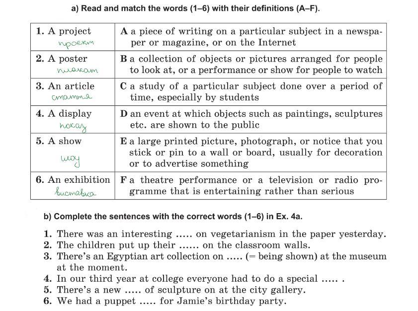 1)article 2)poster 3)exhibition 4)project 5)display 6)show