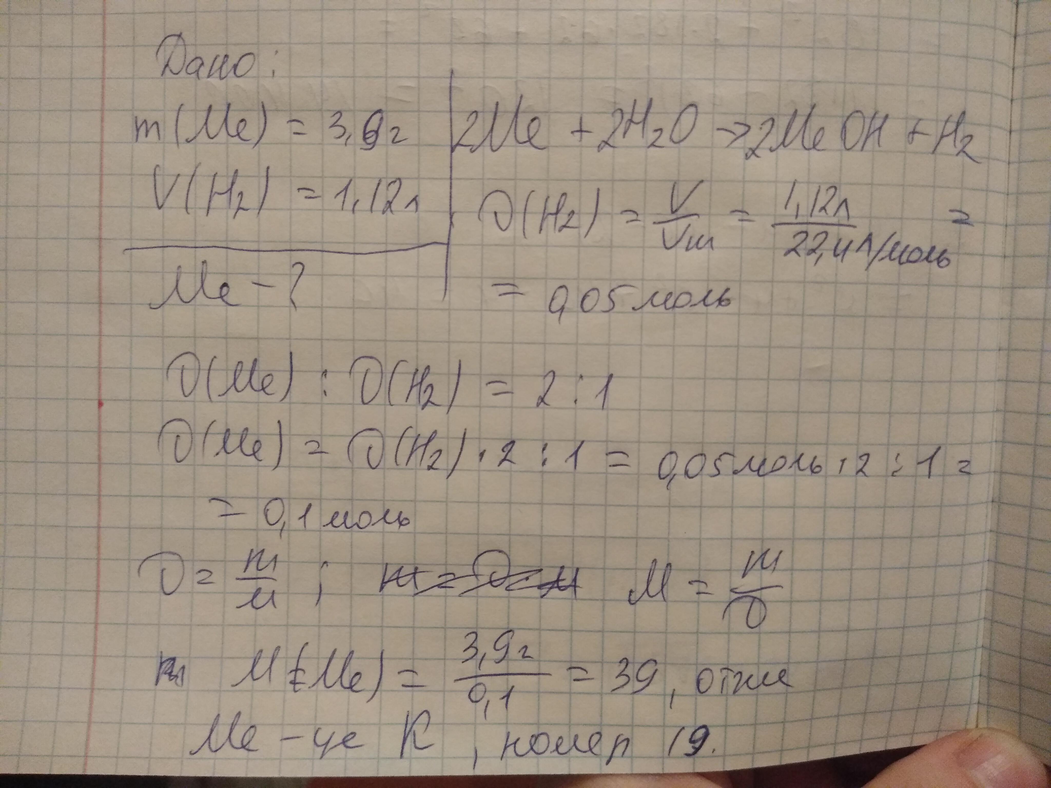 Невідомий лужний метал масою 3,9 г провзаємодіяв з водою, утворився водень об'ємом 1,12 л. Знайдіть метал і вкажіть його порядковий номер.
