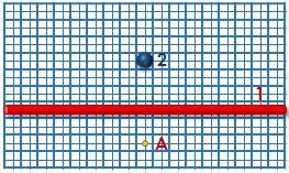 Точка А знаходиться на відстані 2 клітинки від дроту та 8 клітинок від кулі.