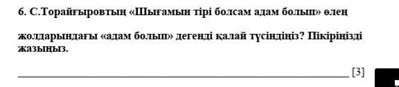 6. С.Торайғыровтың «Шығамын тiрi болсам адам болып» өлеңде «адам болып» дегенді қалай түсіндіңіз? Пікіріңізді жолдарындағы жазыңыз. [3]