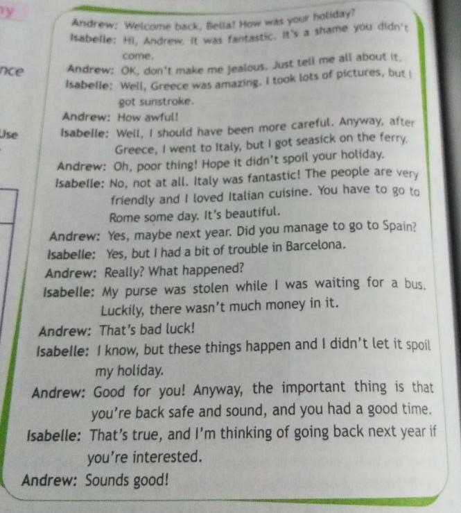Андрей приветствует Беллу и спрашивает, как прошел ее отпуск. Белла отвечает, что он был фантастическим, и жалеет, что Андрей не поехал с ней. Андрей просит рассказать ему обо всем. Белла говорит, что Греция была удивительной, но она получила солнечный удар. После Греции она отправилась в Италию, но на пароме ей стало плохо. Несмотря на это, она наслаждалась Италией и встреченной там дружелюбной атмосферой. Белла рассказывает Андрею о своей поездке в Испанию, но признается, что ее кошелек был украден в Барселоне, когда она ждала автобус. Тем не менее, она не позволила этому испортить свой отпуск. Андрей отмечает, что самое главное, что Белла вернулась целой и невредимой, и хорошо провела время. Он предлагает вернуться в следующем году вместе, и Белла соглашается.
