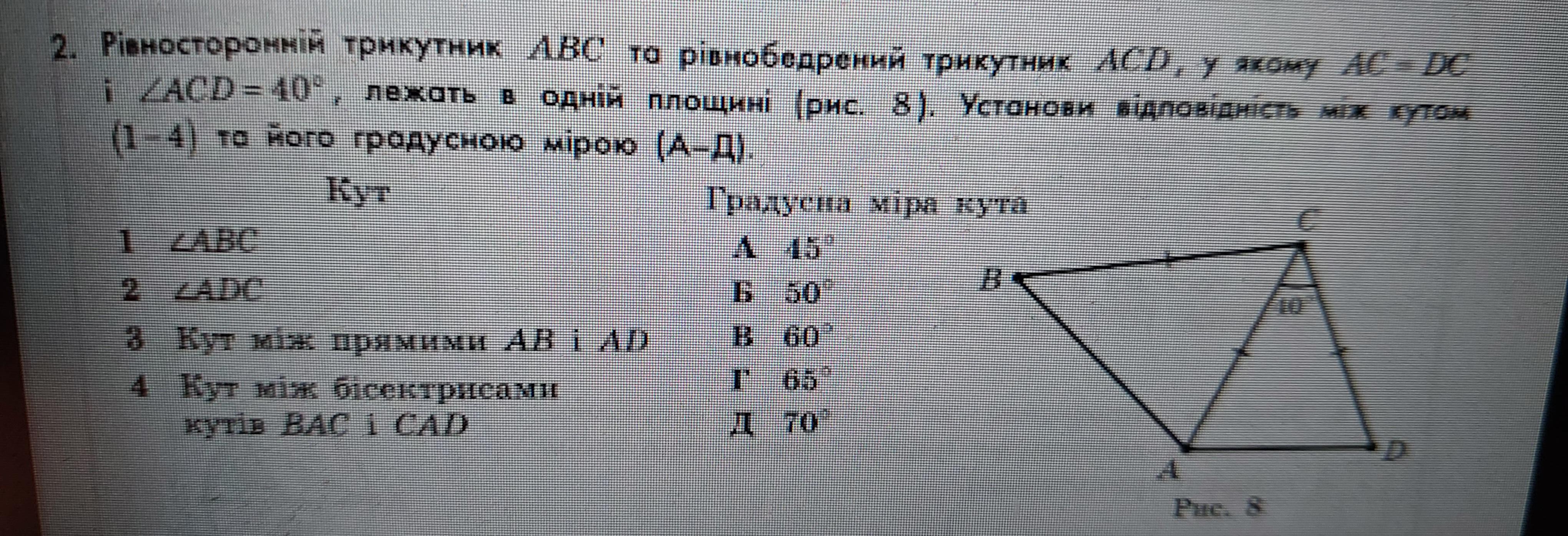 рівнобедрений трикутник ABC та рівнобедрений трикутник ACD, у якому Ac=Dc i ACD=40° лежать в одній площині. Установіть відповідність між кутом 1-4 та його градусною мірою.
