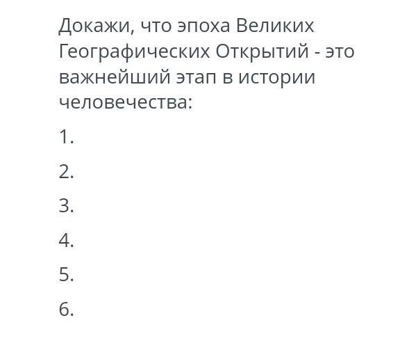 Докажи, что эпоха ВеликИХ Географических Открытий - это важнейший этап в истории человечества: 1. 2. 3. 4. 5. 6. даю 15 баллов