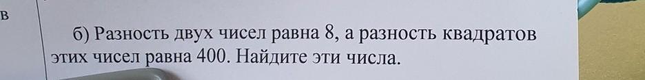 -79 б) Разность двух чисел равна 8, а разность квадратов Этих чисел равна 400. Найдите эти числа. Го