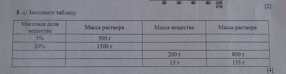 8. а) Заполните таблицу Массовая доля вещества 5% 20% Масса раствора 500 г 1500 г 20 40 60 Масса вещества 200 г 15 г NaCl LI,SO4 80 100 LºC Масса раствора 800 г 135 г [2] [4] б) Определите массу вещества для приготовления 200 мл 0,1 М раствора перманганата калия KMnO4