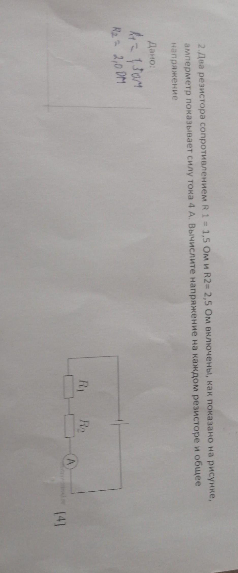 2 Два резистора сопротивлением R 1 = 1,5 Ом и R2= 2,5 Ом включены, как показано на рисунке, амперметр показывает силу тока 4 А. Вычислите напряжение на каждом резисторе и общее Дано: жение