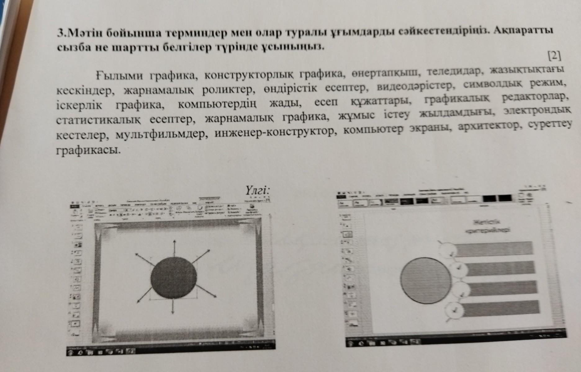 3.Мәтін бойынша терминдер мен олар туралы ұғымдарды сәйкестендіріңіз. Ақпаратты сызба не шартты белгілер түрінде ұсыныңыз. Ғылыми графика, конструкторлық графика, өнертапқыш, теледидар, жазықтықтағы кескіндер, жарнамалық роликтер, өндірістік есептер, видеодəрістер, символдык режим, іскерлік графика, компьютердің жады, есеп құжаттары, графикалық редакторлар, статистикалык есептер, жарнамалық графика, жұмыс істеу жылдамдығы, электрондык кестелер, мультфильмдер, инженер-конструктор, компьютер экраны, архитектор, суреттеу графикасы. Föddadadega!!# Үлгі: [2] Жетістік критерийлері