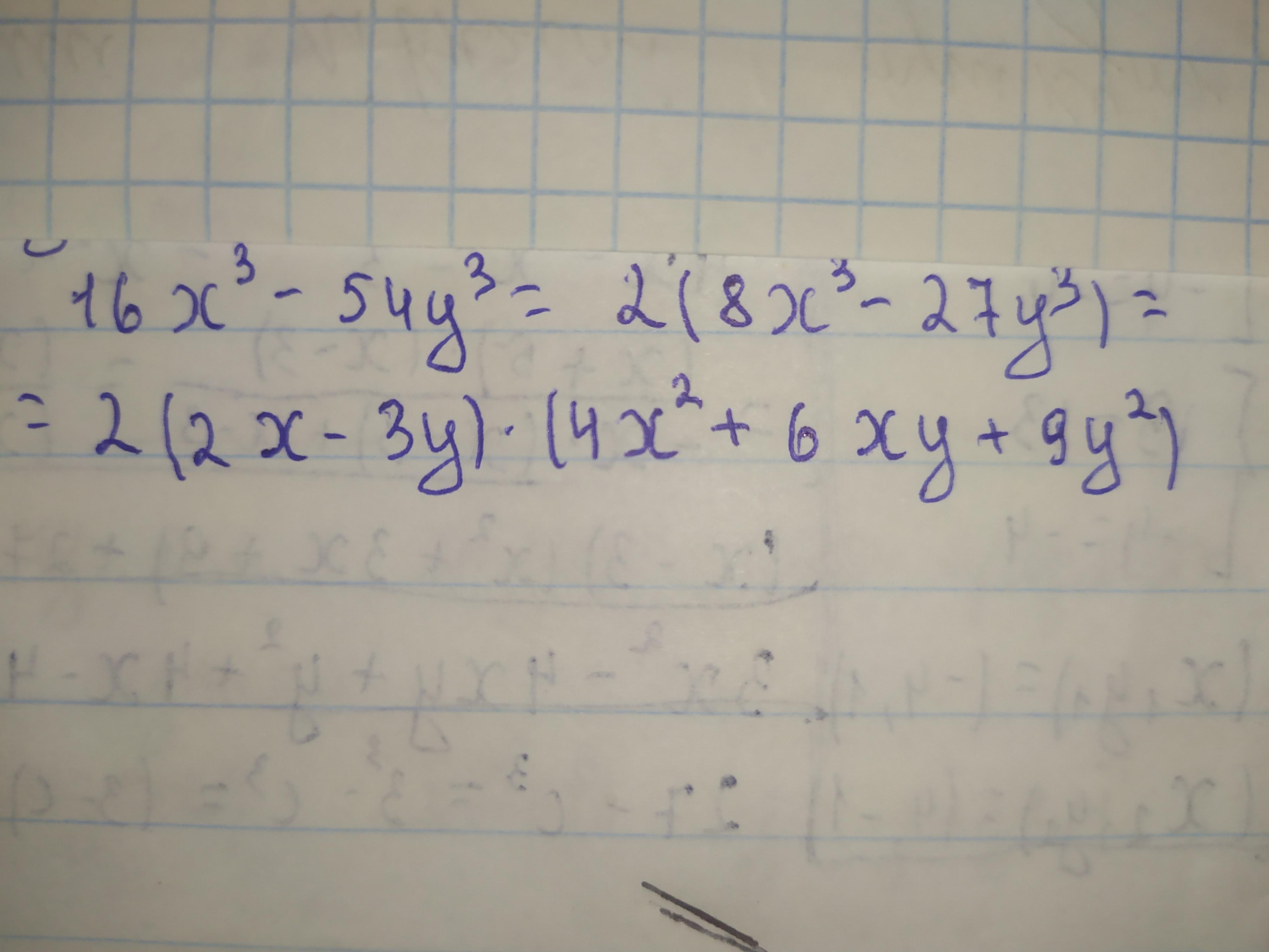 16x³+54y³=2*(8x³+27y³)=2*((2x)³+(3y)³)=2*(2x+3y)*((2x)²-2x*3y+(3y)²)=